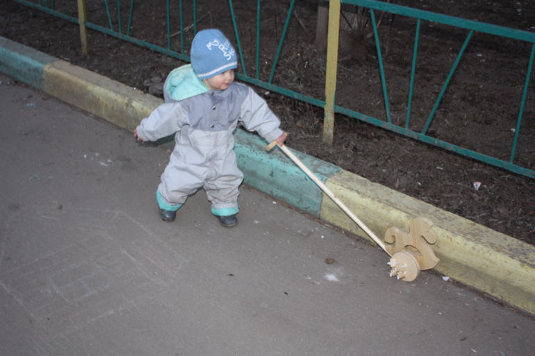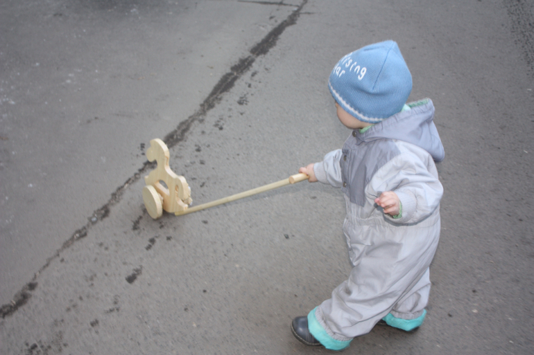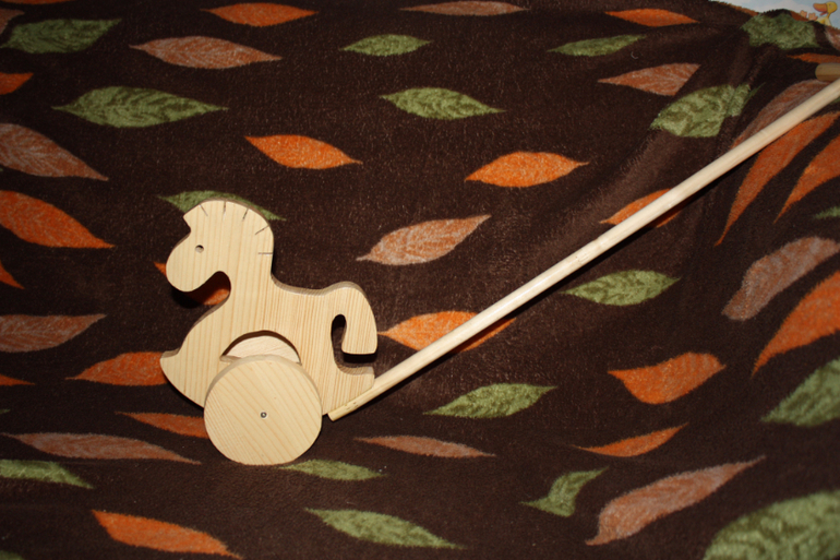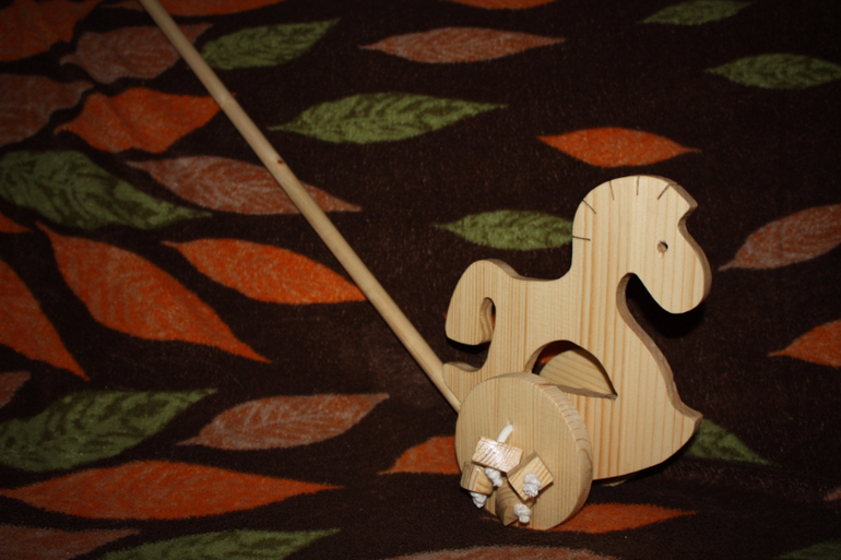 Сделала Димке каталку, чтоб веселей гулять было. Выпилила из соснового мебельного щита, покрыла акриловым лаком