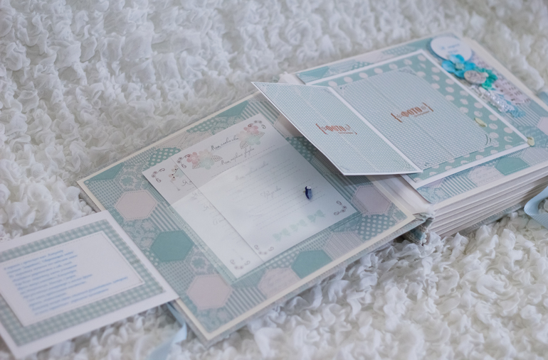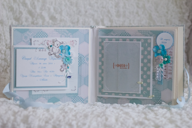 На 7 полных разворотов,весь прошит на машинке, нарядно оформлен по темам, таким памятным и важным для каждой мамы: в ожидании чуда, мое первое фото,встреча из роддома, первая улыбка,шаги и тп. Так же в альбоме мы селаем сложные многослойные и раскладные конструкции,которые позволяют разместить больше фото,чем обычно в таких альбомах. И еще у нас будут новые дизайнерские карточки про развитие,зубки и тому подобное.