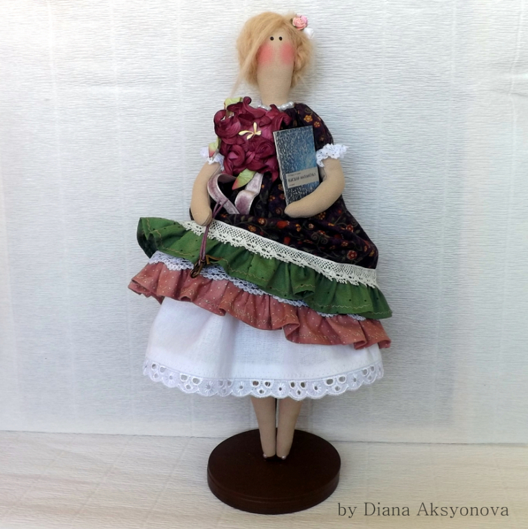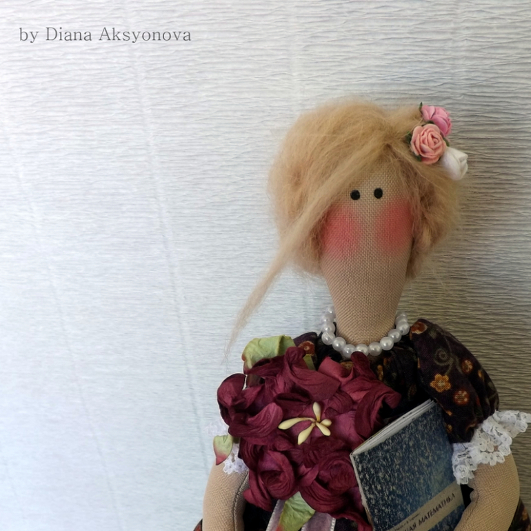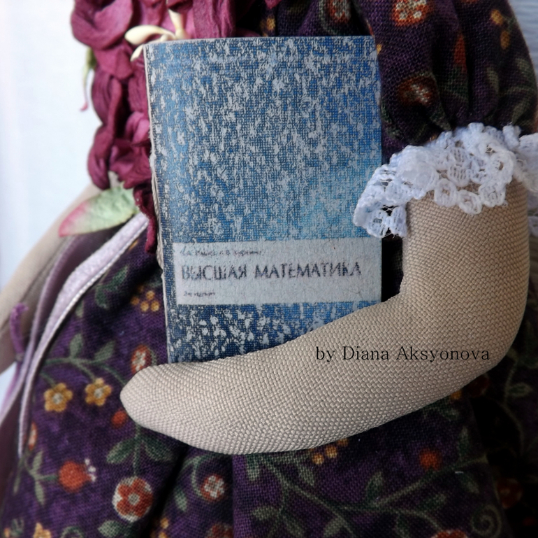 Барышня сшита на заказ. На выставке со мной была кофейная барышня и девушка, увидев её-сказала:"Мне такую же, в таком платье, на подставочке, только волосы чуть темнее и какой-то предмет, указывающий на профессию!" По-этому чуть изменила платье (невозможно же один в один шить, совсем неинтересно))), в руках учебник и шнурочек с цифрами)
