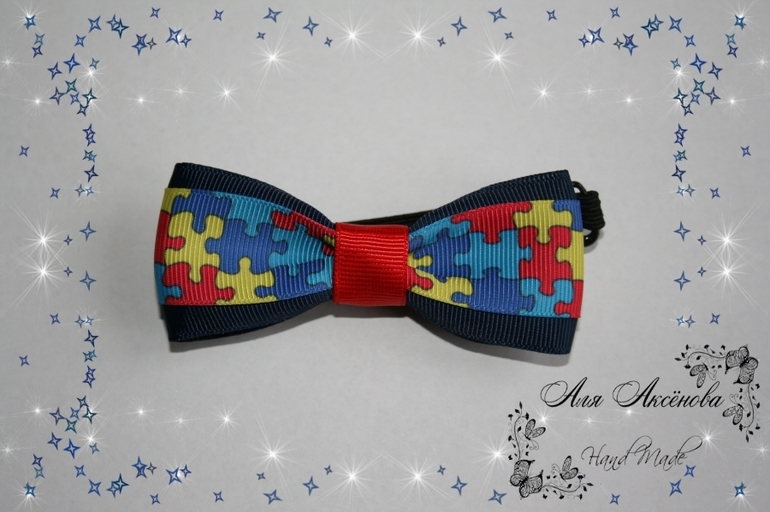 галстук-бабочка для мальчика с рисунком-пазлом, который благодаря своей расцветке подойдет под множество вариантов одежды.