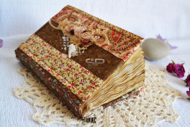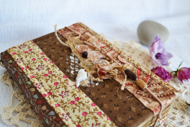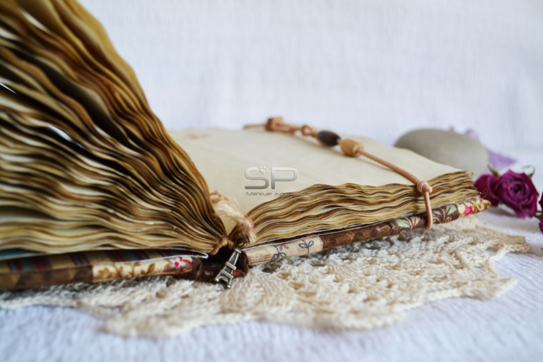 Обложка декорирована кружевом, деревянными бусинами, ракушками и натуральным камнем.