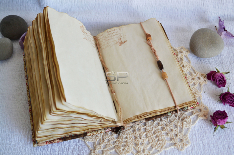 СкрапбукингФормат А6, примерно 10*15см. Блок из писчей бумаги плотностью 65г/кв.м., 100 листов (200 стр.) тонирован-ароматизирован вареным кофе. Обложка мягкая из американского хлопка, внутри флис, закладка джутовый шнур с подвеской. Закрывается на резинку с бусинками одним простым движением.