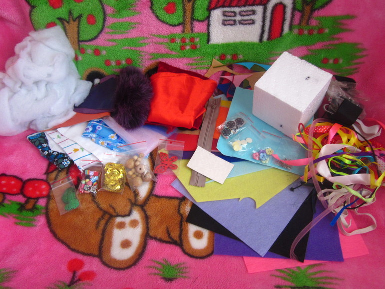 -замочек, пуговички, крючки с петлями, липучка(кружочки с жесткой основой и отрез велькроткани с мягкой основой; ленточная липучка черная), кнопки, бусинки, пайетки, подвесочки, кусочек безопасного заркала(можно вырезать ножницами любую форму);резинка-шнурок, а также отрез бельевой резинки и резинки шириной 2,5 см.