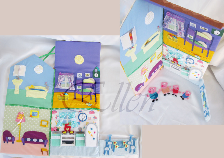 Гостиная. Персонажи на липучках,садятся на диван и кресло. Светильник "включается" и "выключается".Картинки на стене можно поменять,изображение вытягивается и ставится другое.Кухня. Персонажи,чашки на столе на липучках. Все двери открываются,по 2 полки в каждом шкафчике,а также в холодильнике.Духовка тоже открывается. Пейзаж за окном можно сменить.