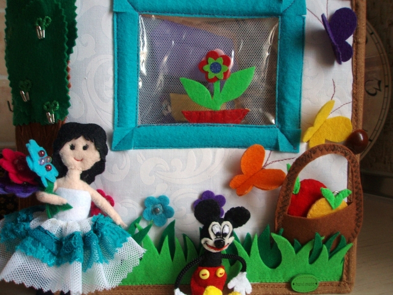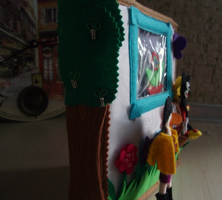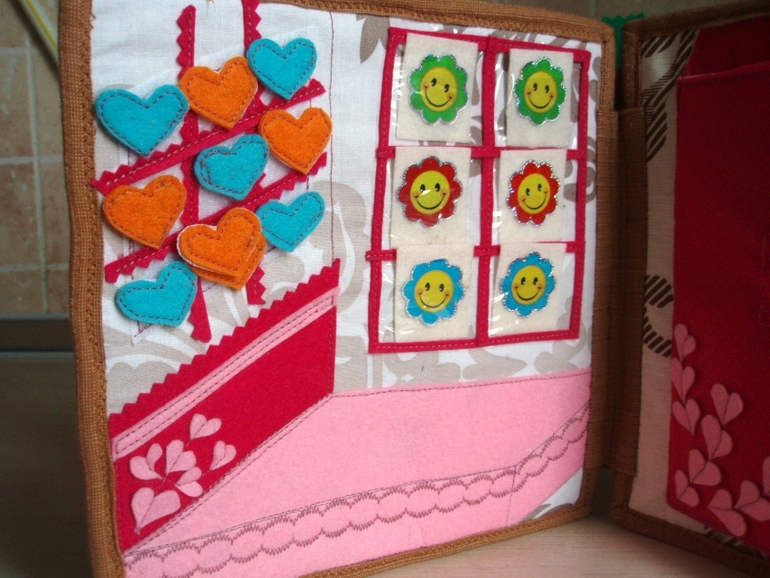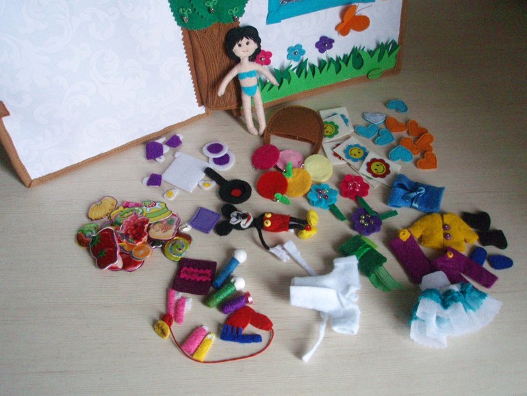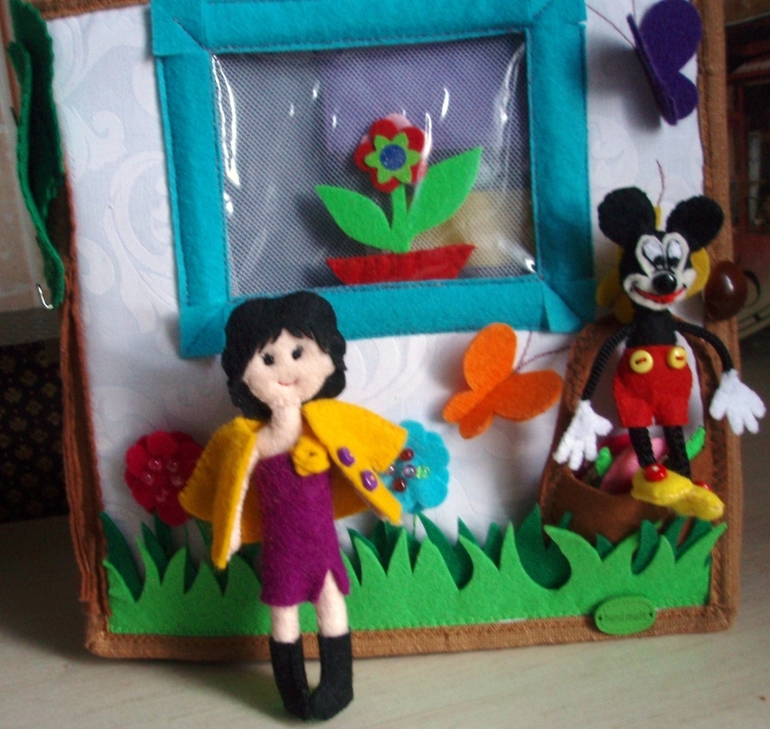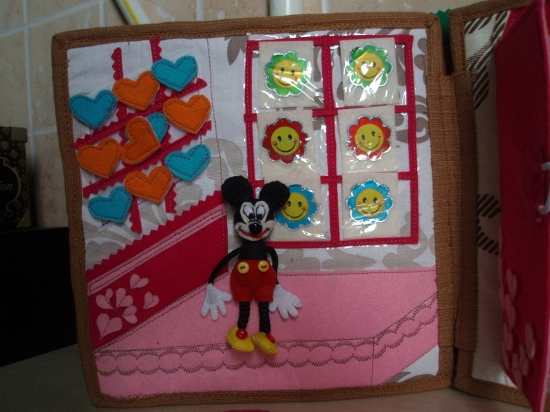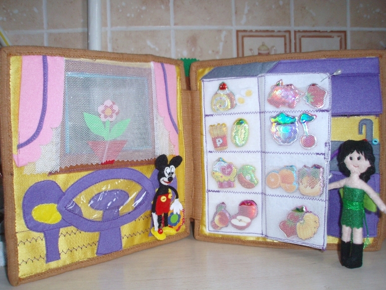 На титульном листе яблонька (фрукты необходимо собрать в корзинку), цветочки (на кнопках, прикреплять по цвету)