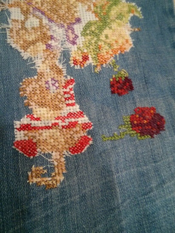 Божьи коровки — это рисунок на водорастворимом флизелине. Приметала на ткань, вышила, постирала и готово)А на джинсе — это еще старинная канва, она легко распускается. Подрезала по контуру рисунка и вперед! Но очень трудно ее убирать из-под рисунка. До сих пор мучаюсь, убираю каждую ниточку пинцетом.