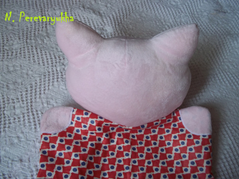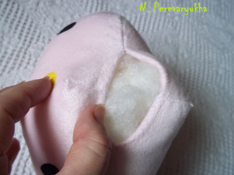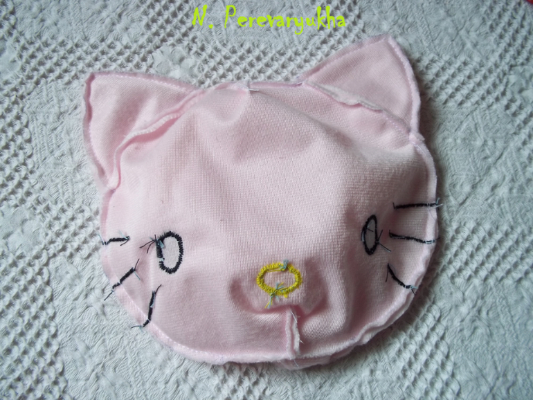Сначала на мордочку пришила глазки, носик и вышила усики, потом пришила ушки, сшила две детали