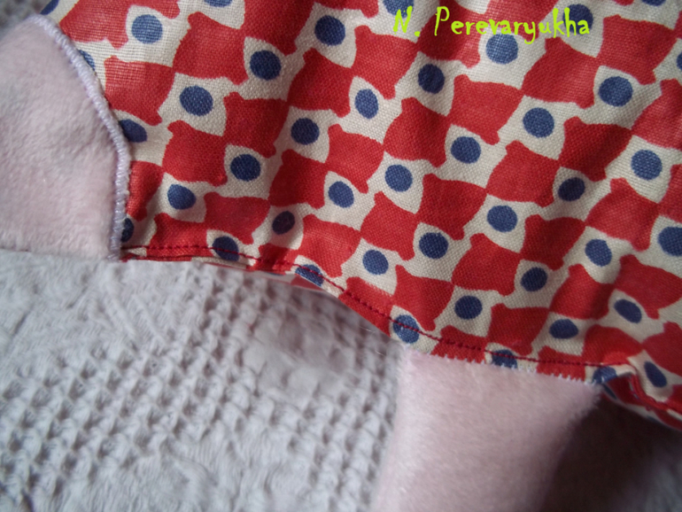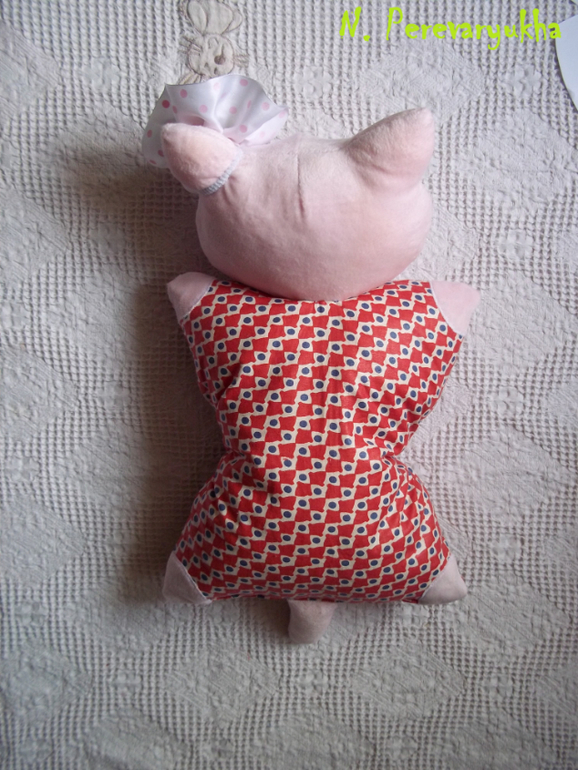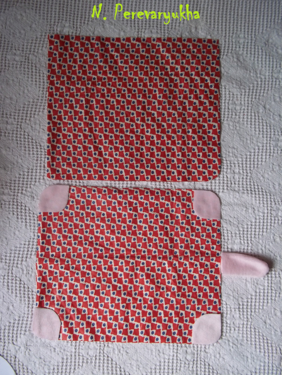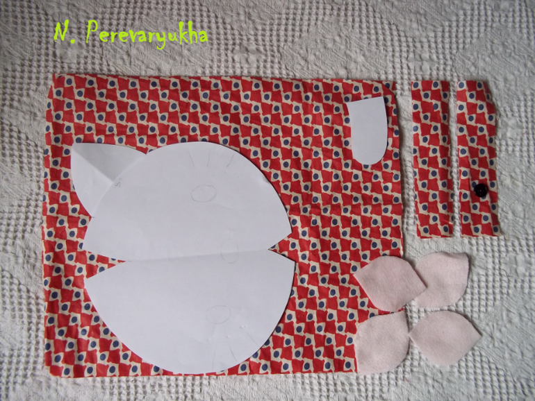 С этой выкройки мне пригодилась мордочка (головка- 2 детали и ушки- 4 детали) и хвостик (2 детали), их я кроила из бледно- розовой плюшевой ткани. Саму подушку шила из хлопка, вот мои детали-
