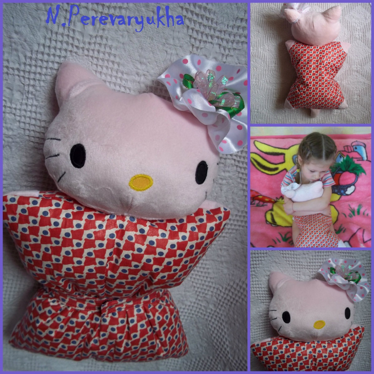 Но так как второй вагончик игрушек в квартире может не поместиться, решила во время ночных и дневных снов доченьки сотворить что- то подобное, и функциональное. В итоге вот такая подушка- сплюшка из мягенькой плюшевой ткани с мордашкой Китти и море счастья