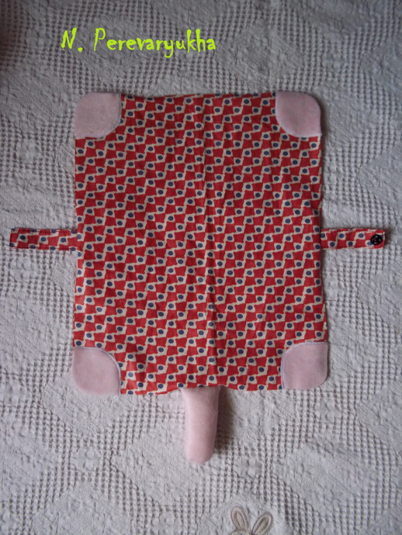 На уголки пришиваю плюшевые лапки (как потом сделала выводы- нужно было и с другой стороны еще 4 лапки, так было бы красивее!) и отдельно шью хвостик, набиваю и пришиваю.