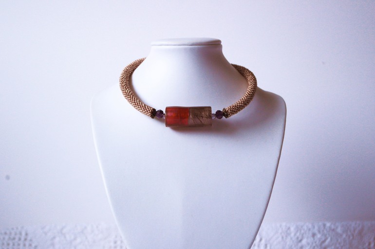 "Красная шапочка" - не знаю, почему))) Наверное, за очень красный цвет) К сожалению, к моменту съемок моя демонстрационная шейка уже сломалась, поэтому только одно фото... Чешский бисер, тонированный коралл, синтетический лунный камень.
