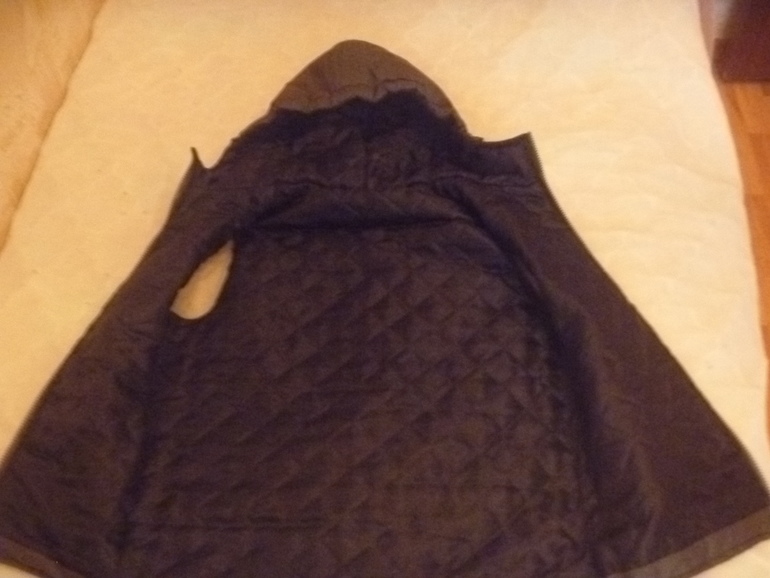 Плащевка, не знаю названия, цвет хамелеон- серый с отливом зеленого и бордового. Очень сильно мнется. Подклад стежка и утеплитель альполюкс 100.