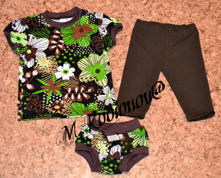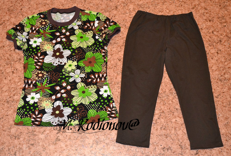 Костюмы состоят из футболок и укороченных по голень лосин. Сшиты в коричнево-салатовой гамме из х/б кулирки (футболки) и кулирки с лайкрой (лосины). Больше фото под катом.