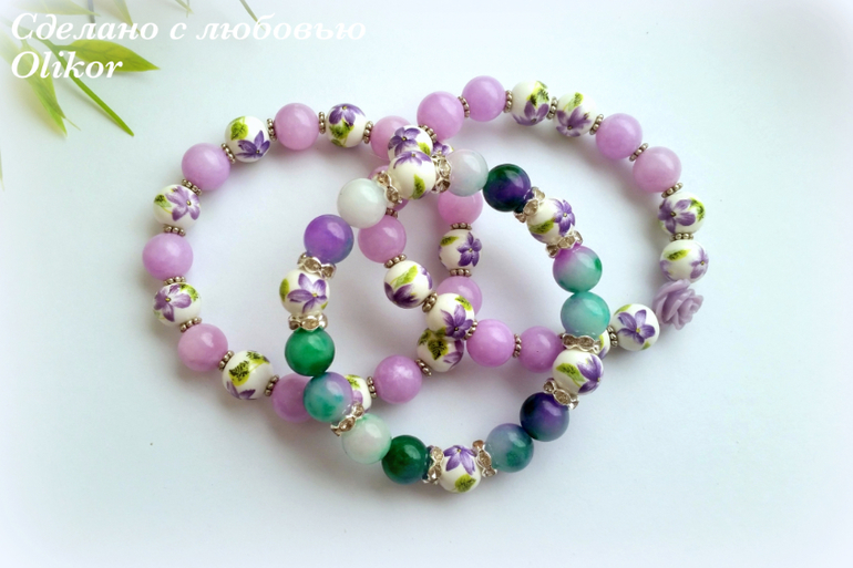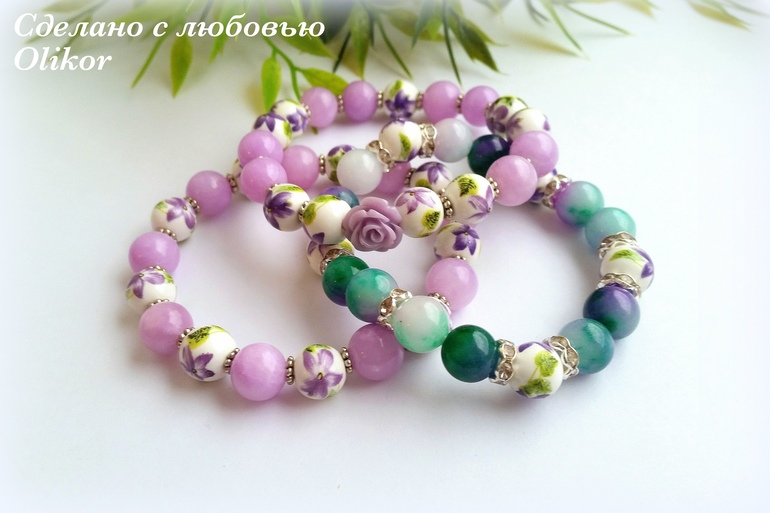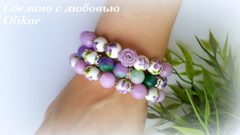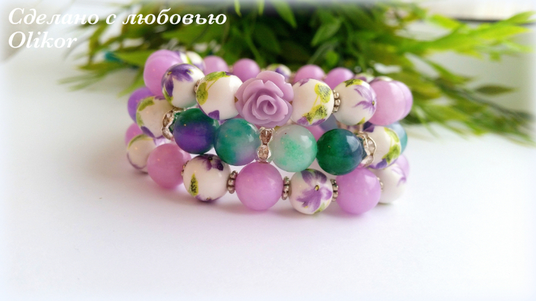 Один из моих любимых цветов - нежный сиреневый: тонированный агат двух цветов, резная роза и керамические бусины с рисунком.