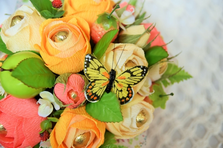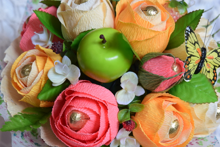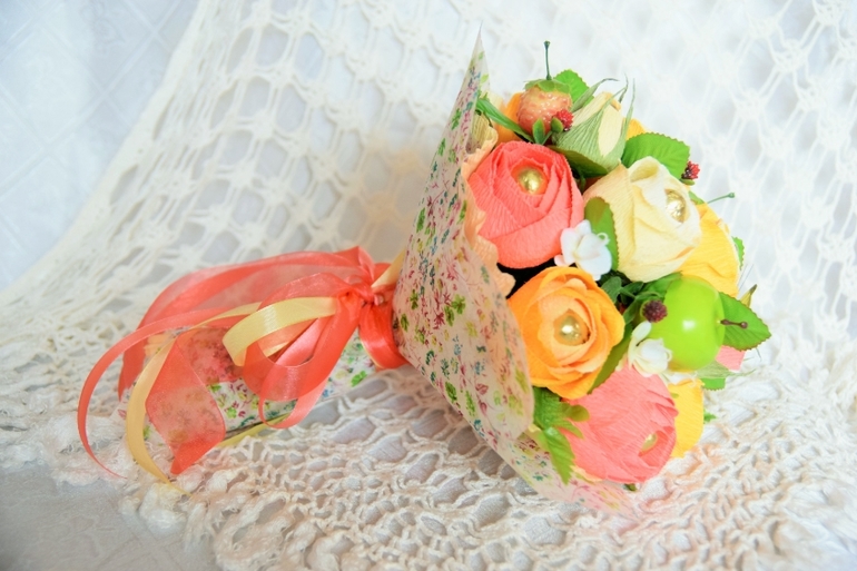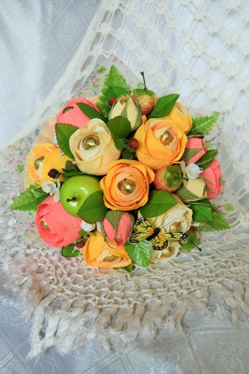 Вот такой букетик, в нем и яблочко, и ягодки, и бабочка и конечно же конфетки 16 шт. Осенний вальс