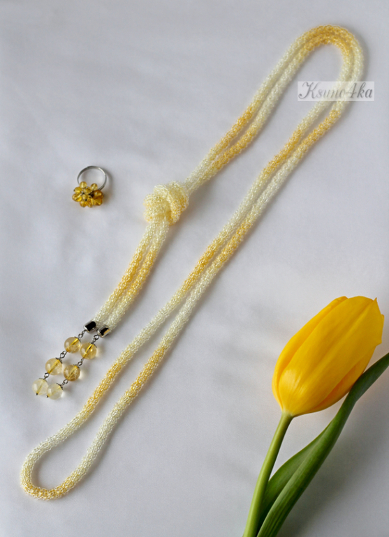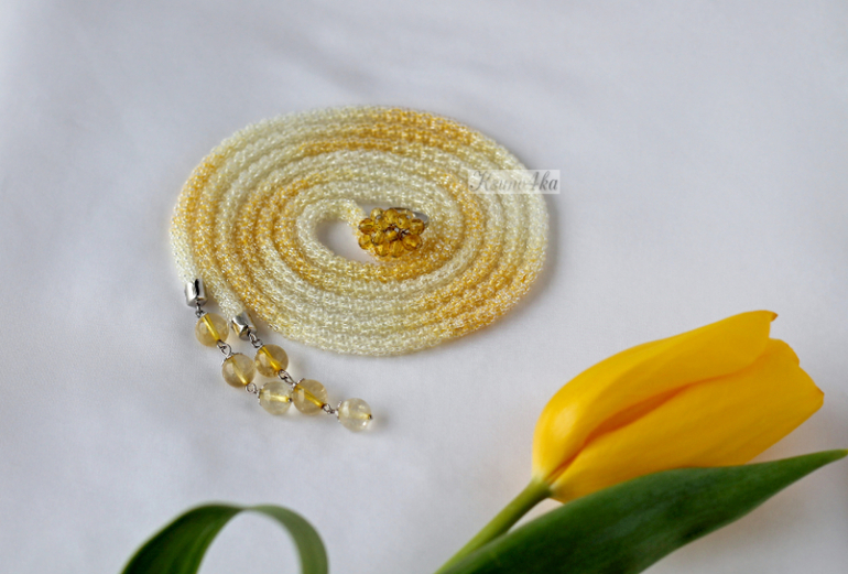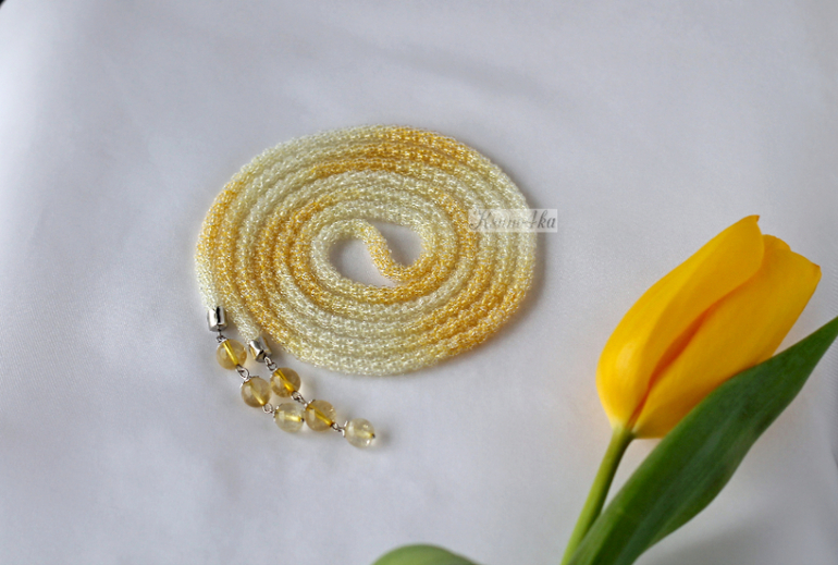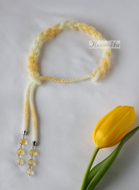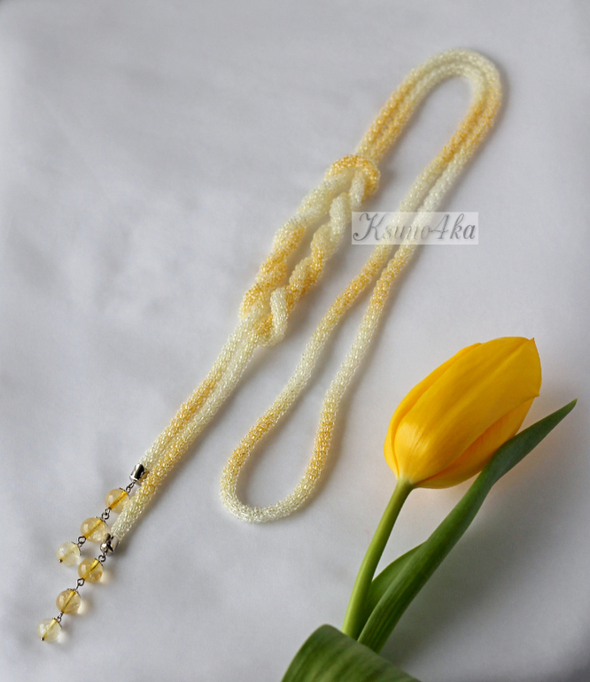 Лариат выполнен из прозрачного чешского бисера и меланжевой ниточки. Также использованы бусины цитрина и фурнитура под серебро.
