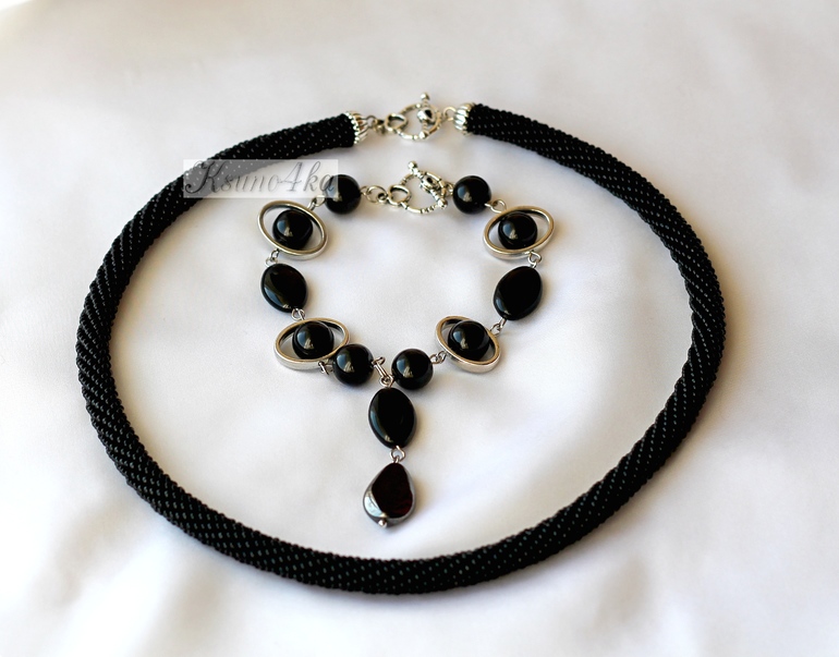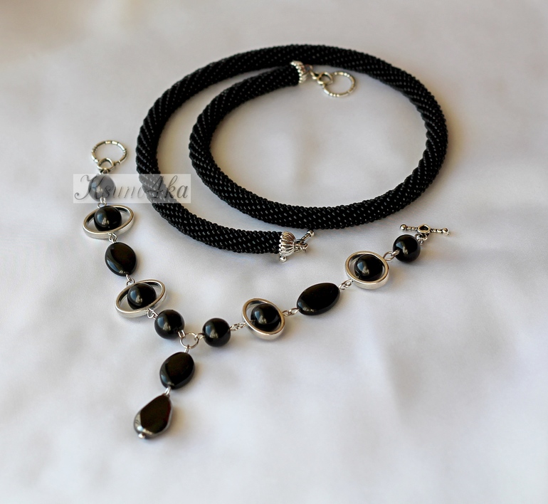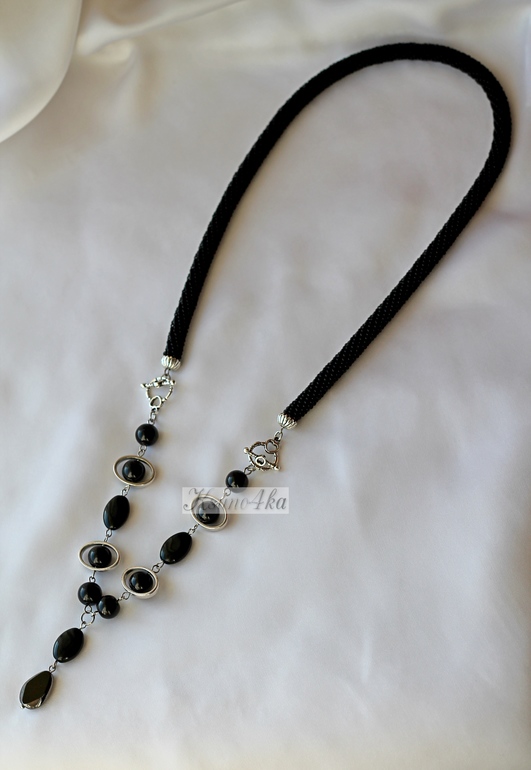 Жгут связан из чёрного чешского бисера. Для съёмной подвески использованы чешские бусины и фурнитура под серебро.