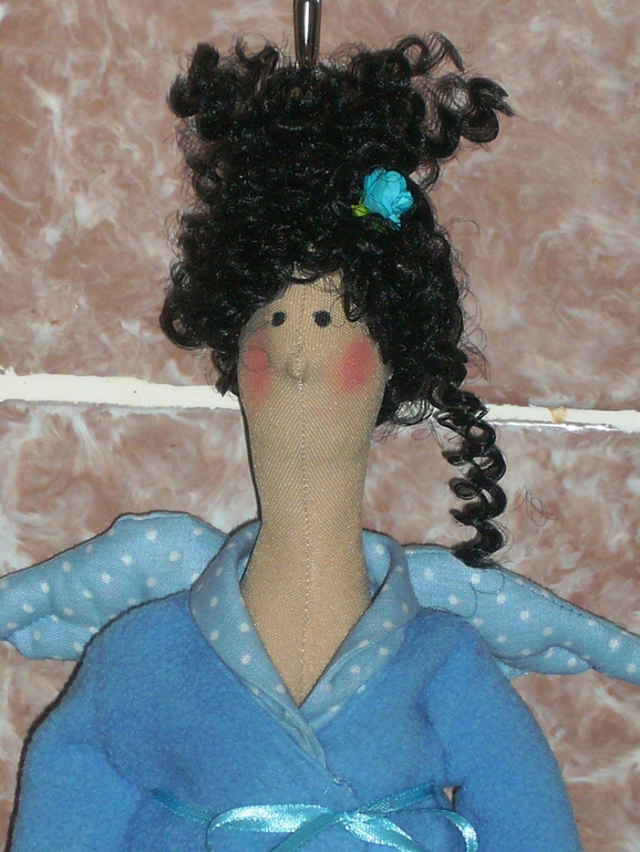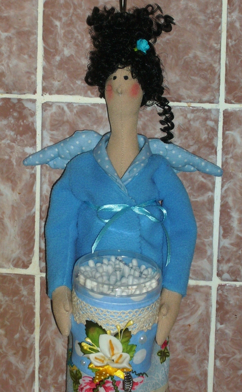 Заказала снова мне хранительницу, в голубой цветовой гамме, девушка ,которая ранее уже делала у меня заказ.Приятно когда заказчики возвращаются снова!!!. Далее ,все как обычно,туба под юбочкой легко заменяется на новую по мере использования дисков,петелька для подвешивания имеется. Является не только декоративным элементом ванной комнаты или туалетного столика,но и имеет функциональное значения для хранения гигиенических принадлежностей.