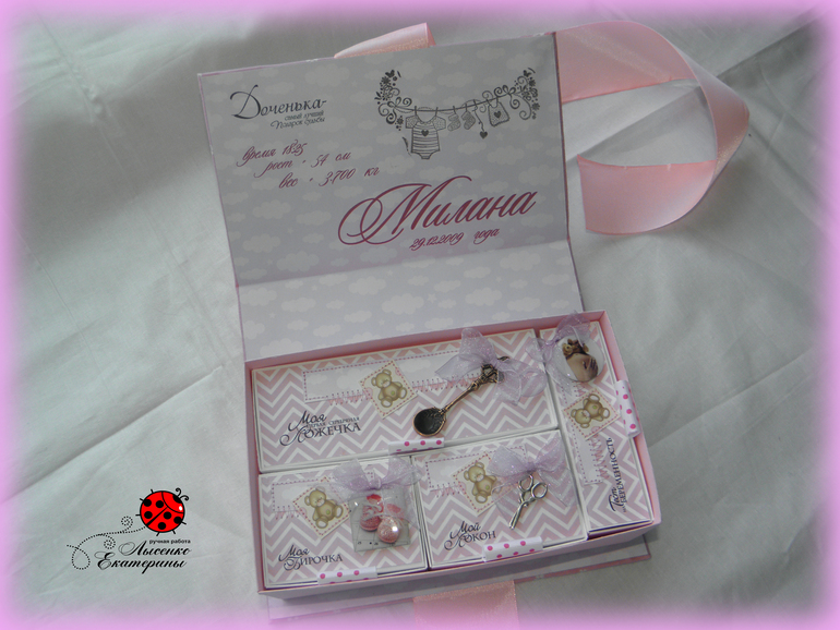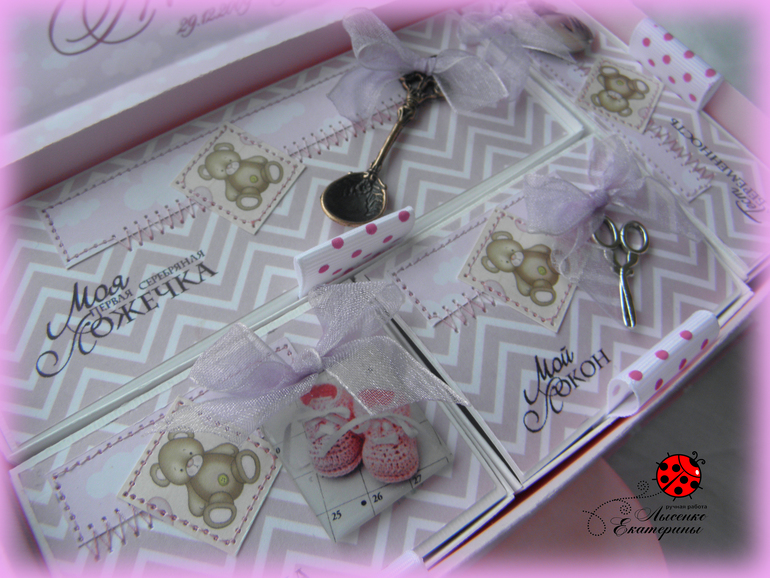 Внутри кробочки под серебряную ложечку,бирочку,локон и тестик)