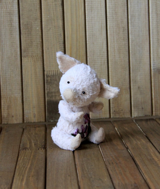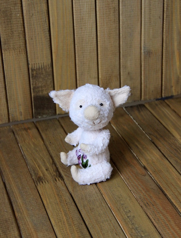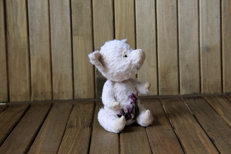 Ростом поросяша 14 см, набита опилочками и приятно пахнет древесной стружкой. 6 шплинтов, стеклянные глазки, любопытную мордочку освещает улыбка.
