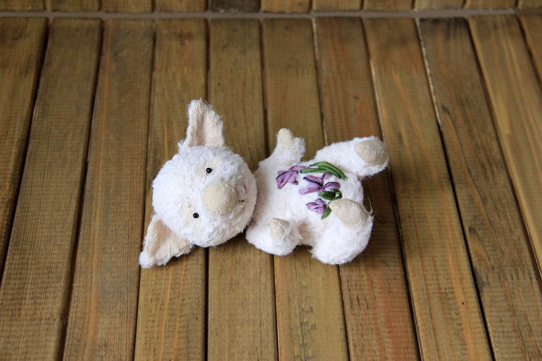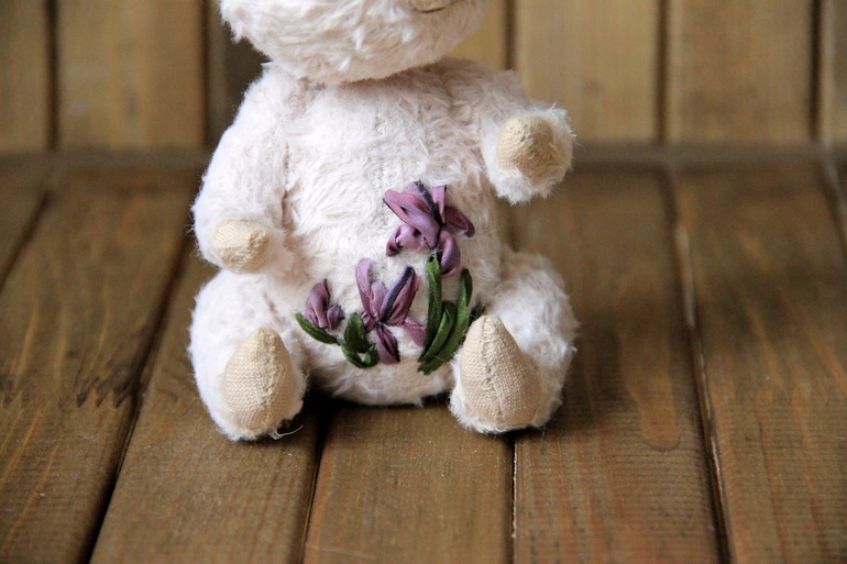 Тедди: мишки и их друзья.Поросена Тедди с вышитыми на брюшке ирисами - очень нежная и трогательная девочка. Она сшита из немецкой вискозы ручного крашения, декорирована шелковыми лентами. Любит сидеть и крутить головой, умеет валяться и стоит с опорой.