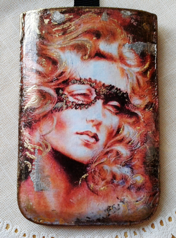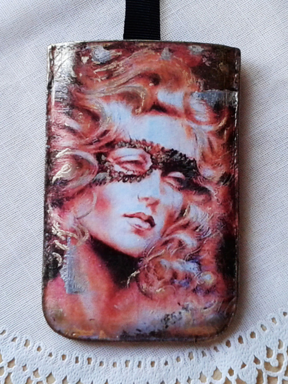 Чехол-карман "Тайна" (для смартфона). Внешние размеры 7,8х12 см. Натуральная кожа высокого качества, внутреннее покрытие синтетическая фланель. В декорировании использованы: лаковая распечатка, поталь (серебро и золото), шеллачный лак (1 слой, так что поталь не окислится и не поменяет свой цвет), акриловый лак, восковая патина (золото), финишное покрытие стекловидный лак.