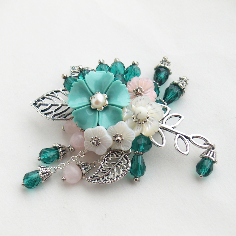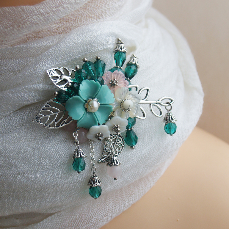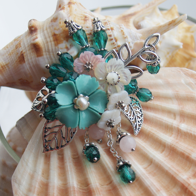 Бижутерия для слингомам. Слингобусы. Грызунки.Яркая и стильная брошь! Напоминает приближающуюся весну! Собрана из резных перламутровых цветов, стеклянных капель и бусин.
