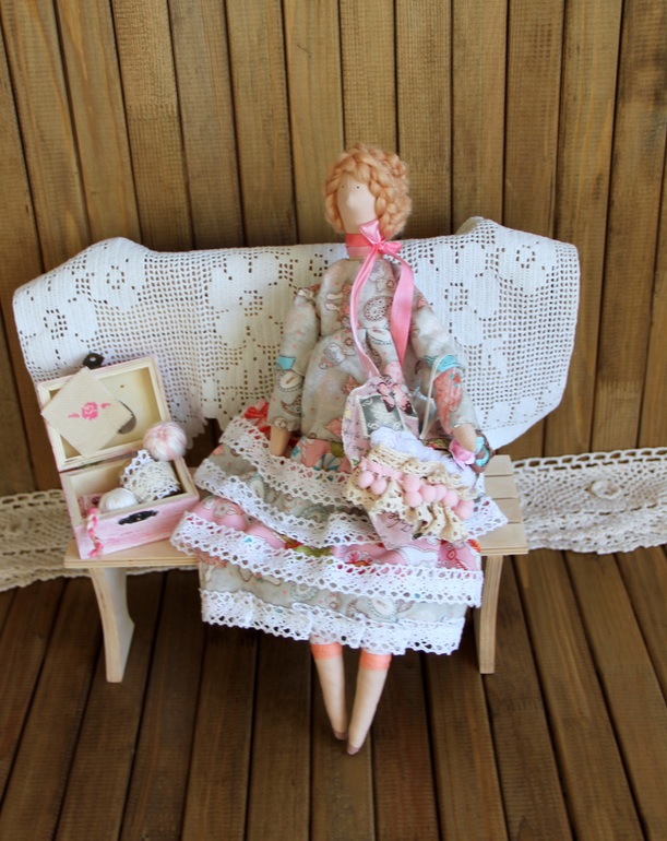 Вот такая она разносторонне одаренная - и вязальщица, и вышивальщица, и шить любит))) Все при ней в сундучке. 43 см, лен и хлопок, акриловые краски, шерсть для валяния.