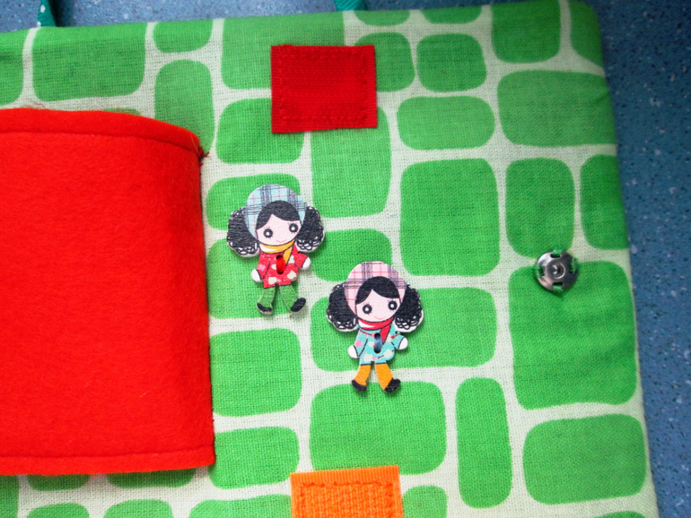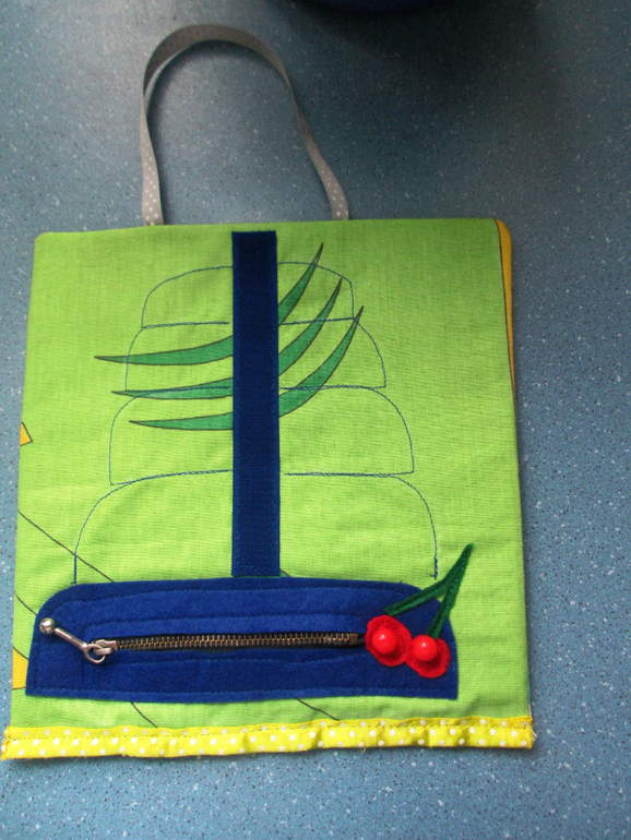 На другой стороне восьмого планшетика у нас "растет" елочка.Ее можно наряжать ,как настоящую.Специально для этого я пошила миниатюрные елочные игрушки.Благодаря этому ребенок учится самостоятельно наряжать елку и у него развивается мелкая моторика рук.Так как игрушки довольно таки мелкие,но тем не менее очень удобные в использовании: