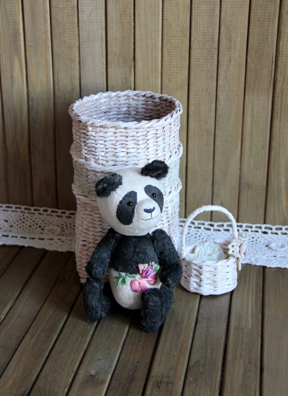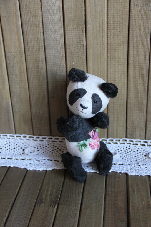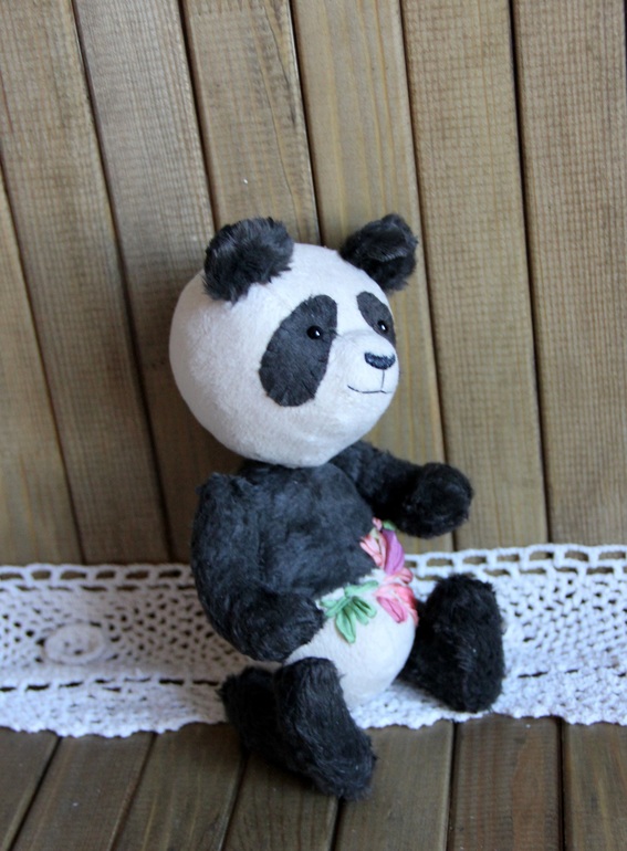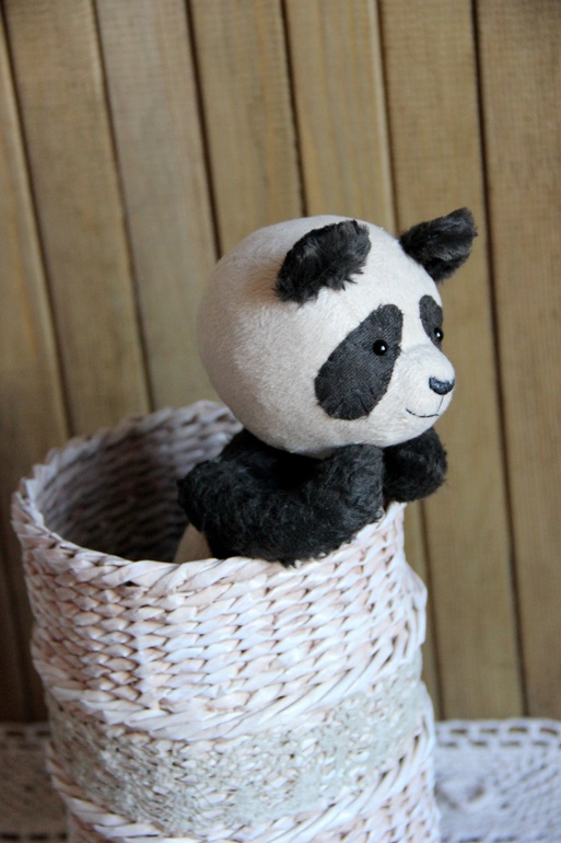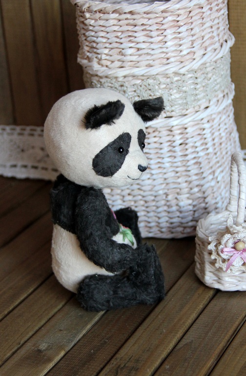 Тедди: мишки и их друзья.Хочу Вам представить счастливую панду Альфреда. Со вчерашнего дня он живет на полке, среди плетеных корзин, поедает бамбук и загадочно улыбается. Добрый и обаятельный парень, панда пахнет опилками - он ведь набит ими.
