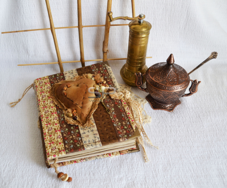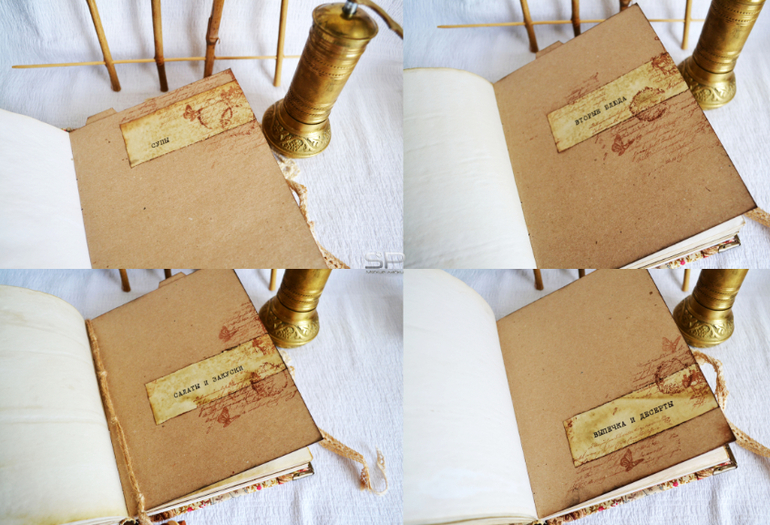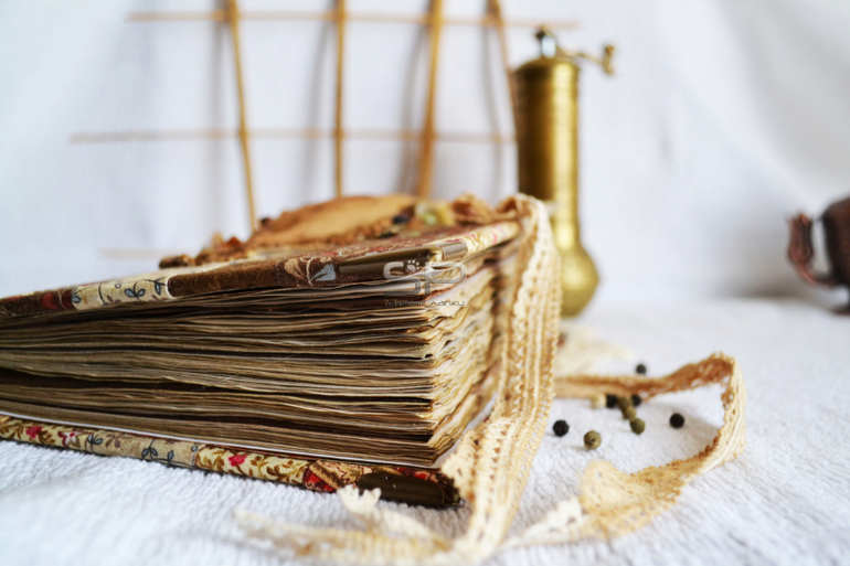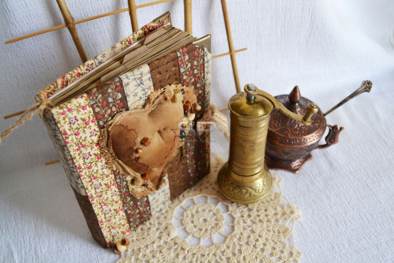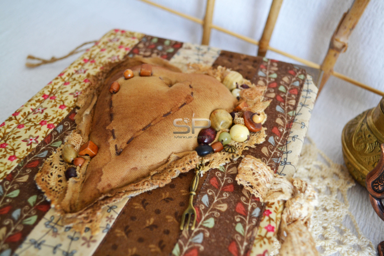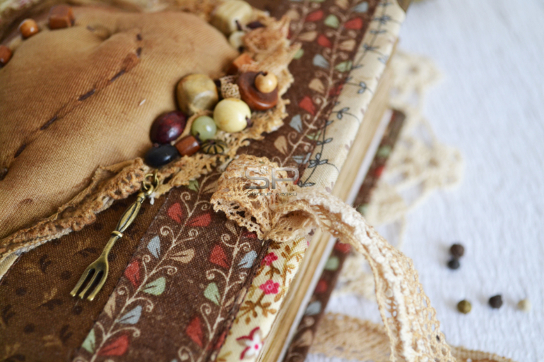В Книге 4 разделителя-кармана из жесткой крафт-бумаги. На форзацах размещены таблицы мер и весов продуктов. Есть петелька для карандаша и петелька для подвешивания на кухонный крючок (можно легко убрать). Углы защищены металлической фурнитурой. Декорирована деревянными бусинами, ониксом и фурнитурой под бронзу. Сердечко ароматизировано, наполнены кофе, корицей .