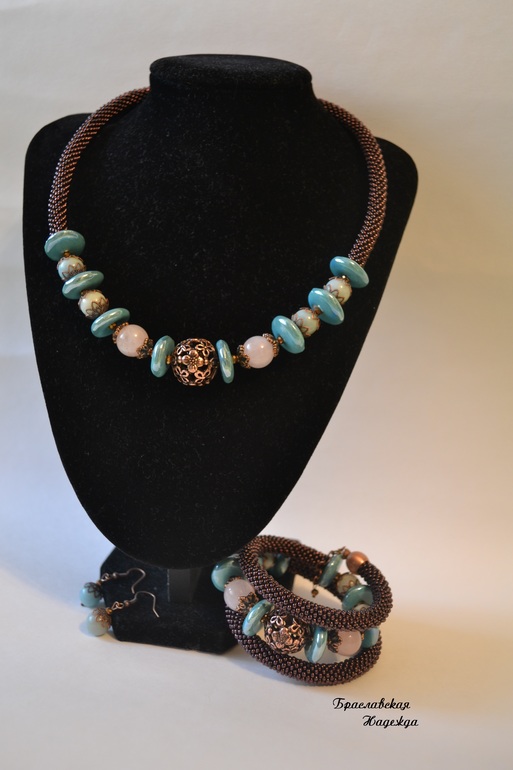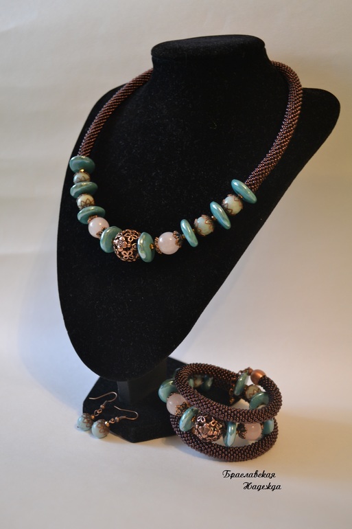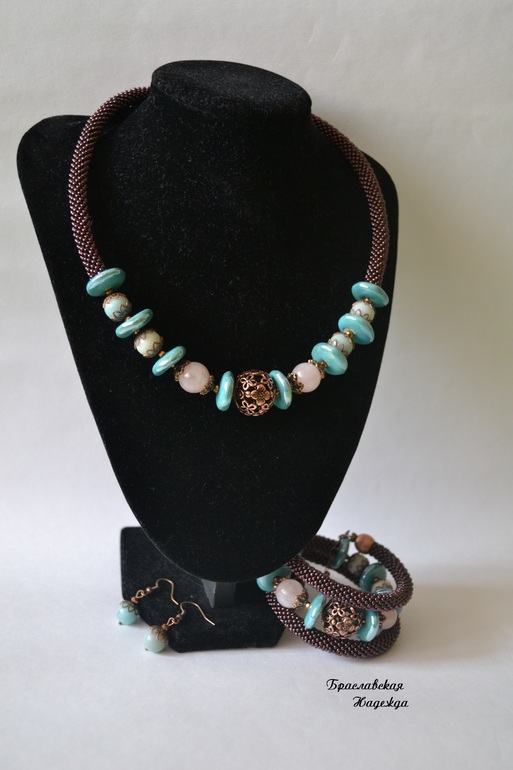Бижутерия для слингомам. Слингобусы. Грызунки.Собрала себе вот такой комплектик. "Сардиния". Бисерные жгутики из чешского бисера, бусины кварца и амазонита разделены керамическими дисками Tesoro. В центре бус и браслета красивые бусины с цветочным орнаментом.
