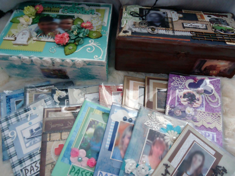 СкрапбукингИ альбом, и куча обложек для паспорта, и блокноты, в том числе кулинарный, и пару деревянных шкатулок(частично освоила и декупаж, а кому щас легко??))