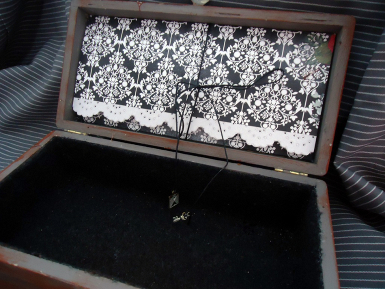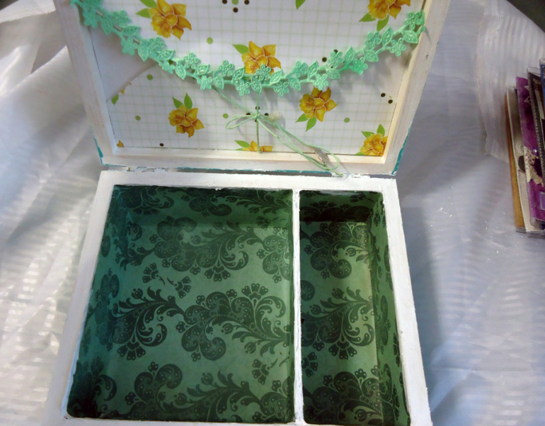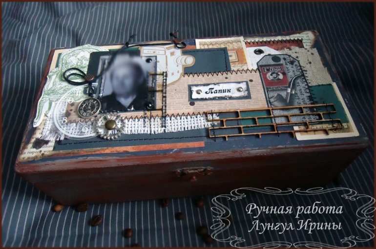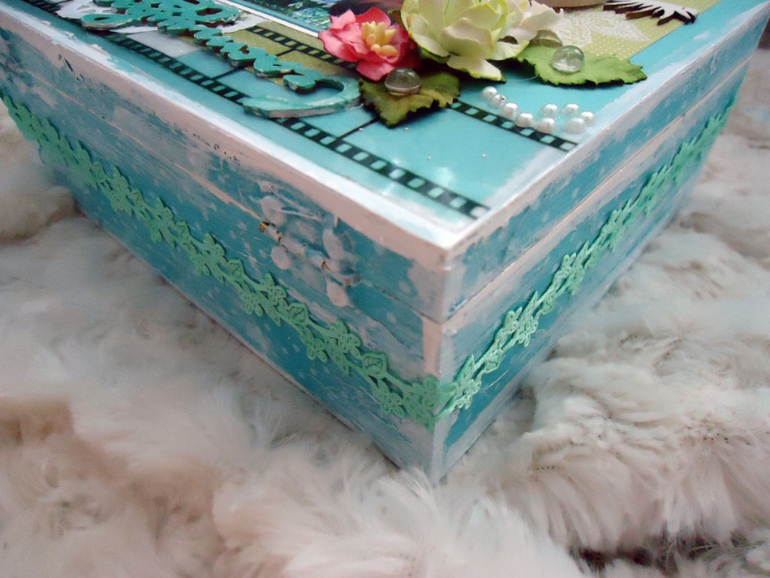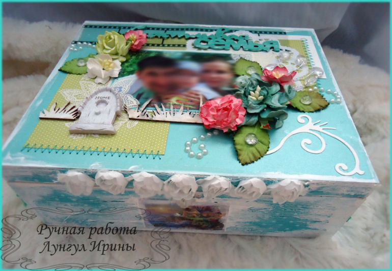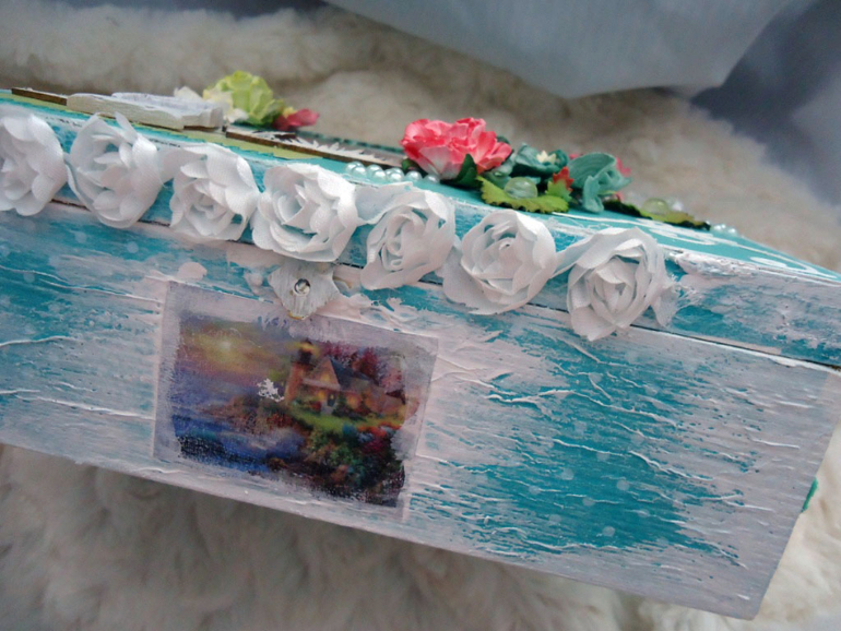 а вот тут саму бирюзовую шкатулку задекупажила...честно говоря-сам процесс не очень понравился-рутинная работа-не мое)) , да и фантазировать там нечего-покрыл акриловым грунтом, приклеил салфетку-покрыл лаком(ну и сверху лага еще поиздевалась краской) ...и все..скучно)),то ли дело - скрап..)))