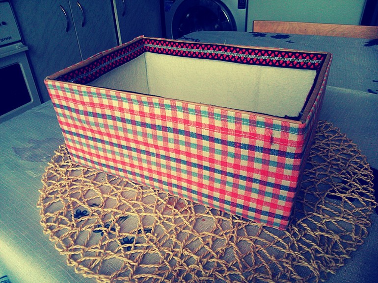 Декор, витражи.Вот такая вот коробочка для мелочей получилась вследствие необходимости экономии денежных средств. Берём коробку из-под обуви и обклеиваем её тканью. И внутри тоже. Украшаем тесьмой.