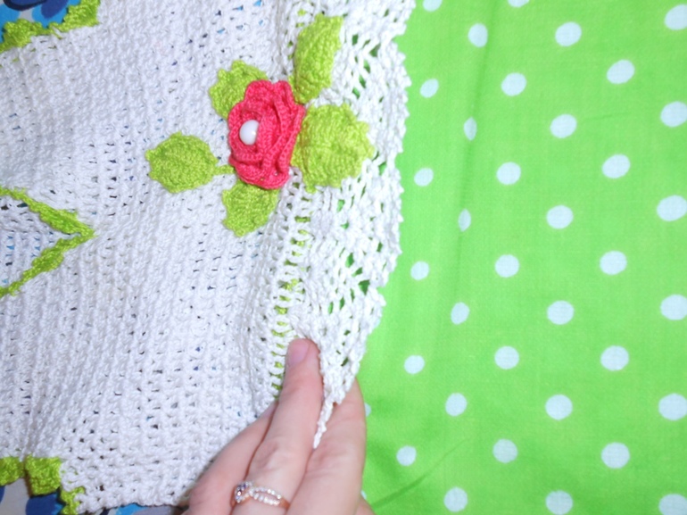 Рюшу вяжем для того чтобы легче было скрыть недочёты при пришивании ткани, внизу под рюшей вяжем несколько дополнительных рядов - к ним мы и будем пришивать ткань, а рюша сверху будет закрывать этот шов. Вот они, я связала 3 ряда под рюшей (где находится большой палец)