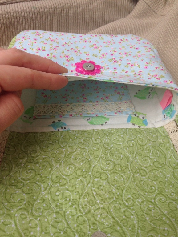 Внутри совушки, один кармашек для платочка. Еще петельку зачем-то сделала.. Ну может пригодится) ручку там вставить или брелочек пристегнуть)