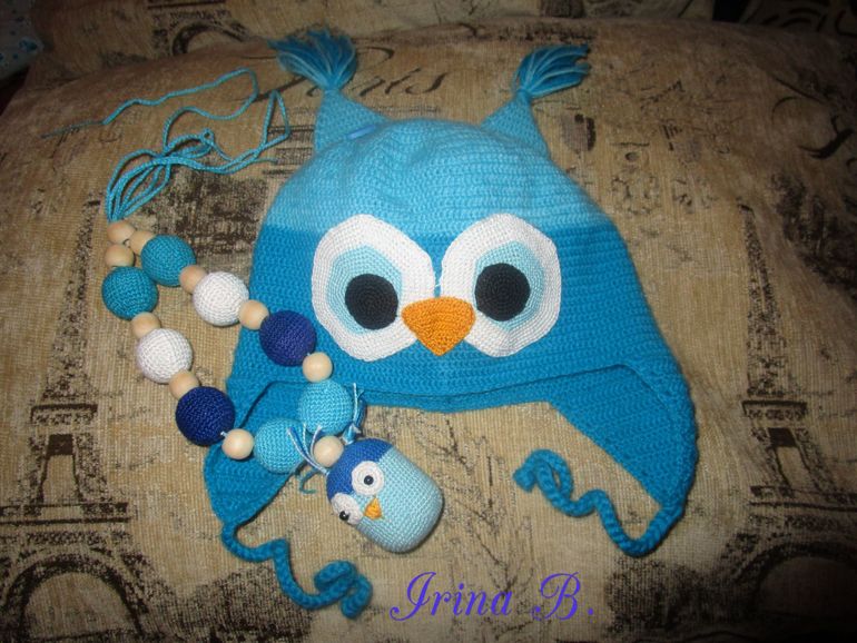 Шапка связанна из ниток пехорка "детский каприз",мордочка и обвязка бус нитками "Ирис"...размер 46-48