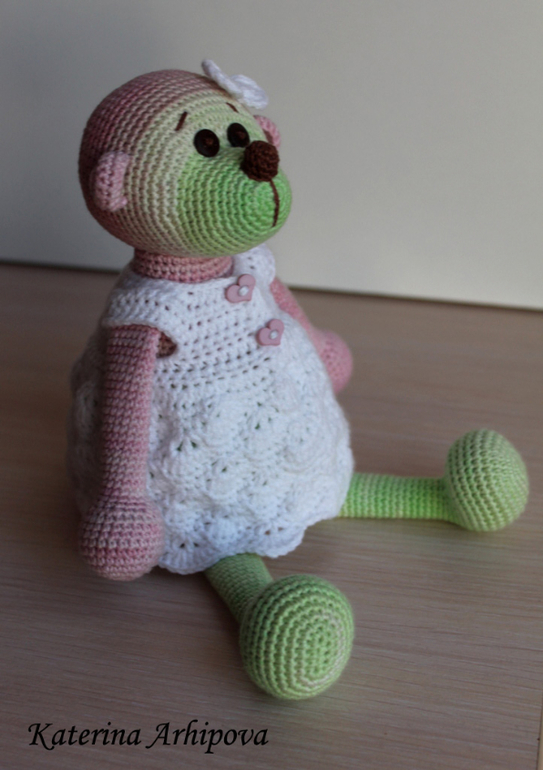 Вот такая мишка была,связанна из секционной пряжи. Рост 15см+ножки. Платьишко снимается.Напомнила мне тюльпан-эта мишка))))