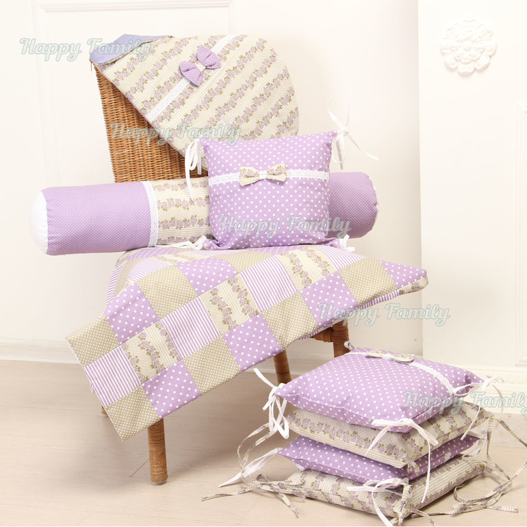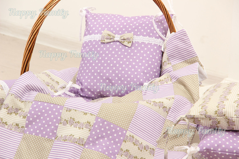Комплект в кроватку малышки состоит из 6 бортиков-подушек (3 в горошек с хлопковым кружевом и бантиком и 3 с розочками); лоскутного пледа и валика в кроватку. Кружево получила в подарок от своего любимого поставщика тканюшек и оно просто отлично вписалось!