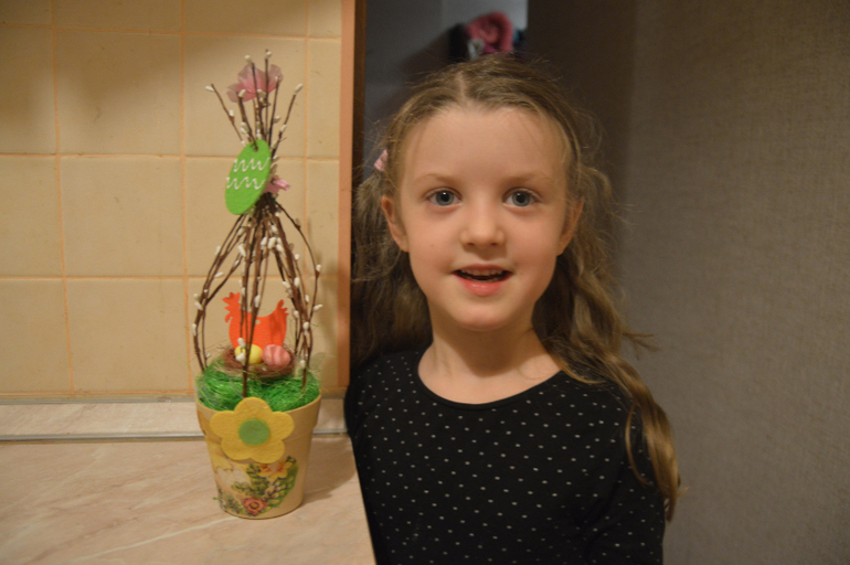 На мой взгляд цветочек на горшочке лишний, но ребенок сказал, пусть будет. А здесь она решила попозировать со своей поделкой.
