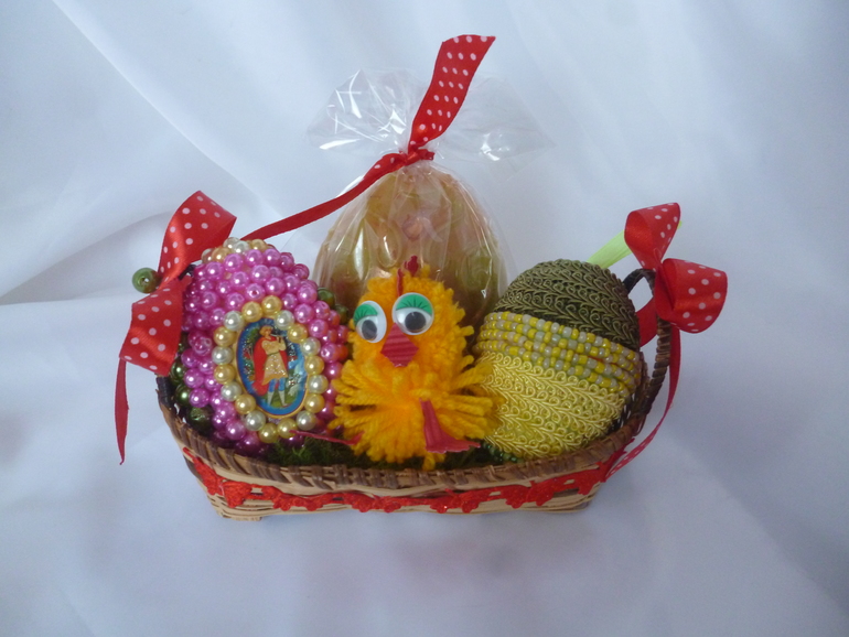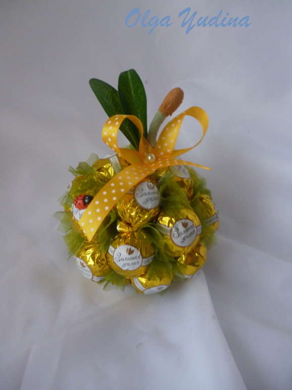 И с ребенком делали ещё к выставке (не из конфет,но похвастаюсь,мелкий насаживал бусины и бисер на ниточку, клеил,и варили вместе мыло в форме яичка):