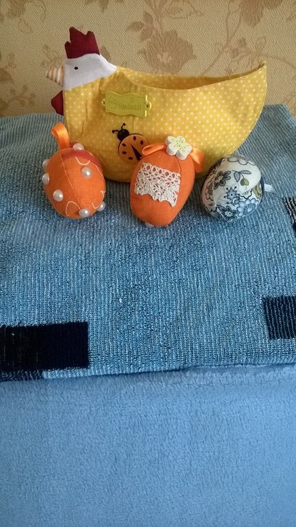 Сынуля долго не выпускал из рук курочку и пасхальные яички))) Еле забрала, для того чтобы сфотать. Мужу Юлия прислала большущее полотенце, от мужа отдельное спасибо! Он только никак не мог понять почему и ему перепал подарочек)) Фото сверху, на полотенце курочка)