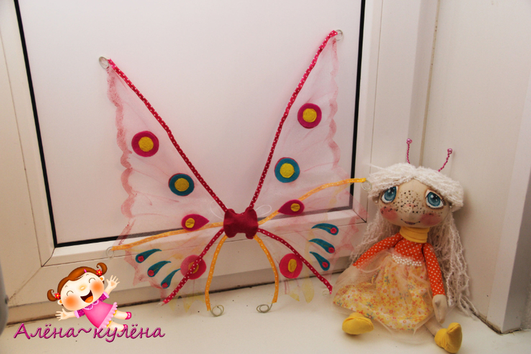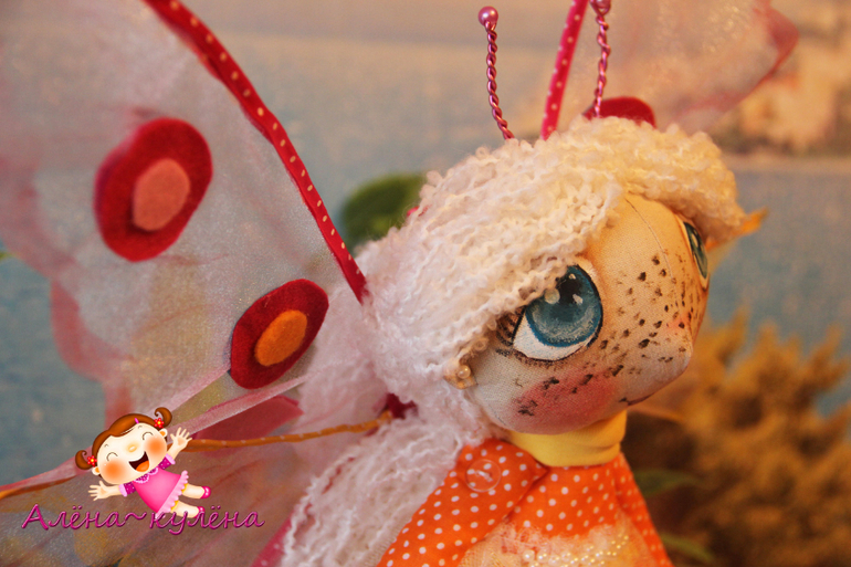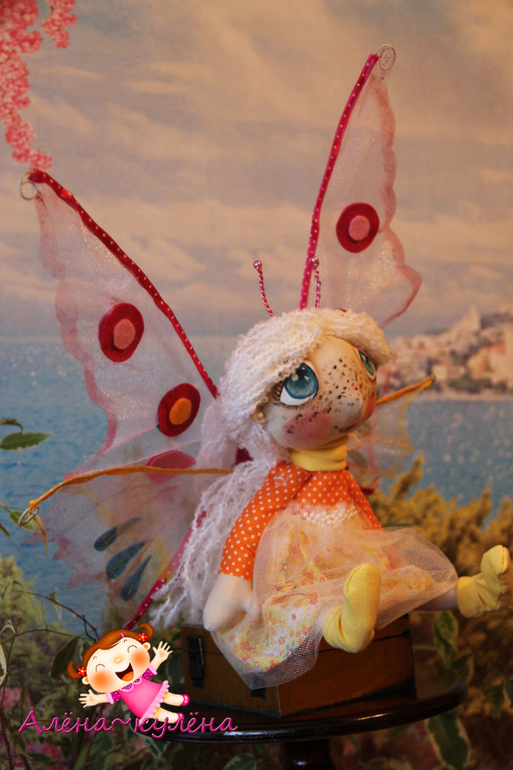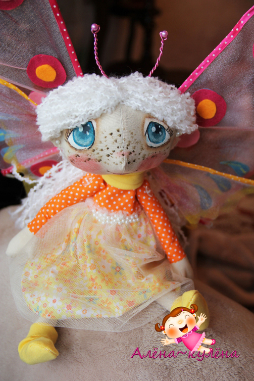 В этот раз выставляю на Ваш суд белокурую девочку-бабочку, зовут малышку Ассоль, ростиком - 30 см, девочка сидит самостоятельно, не стоит, одета в солнечное платьишко, да и вообще солнышко ее любит...крылышки снимаются...