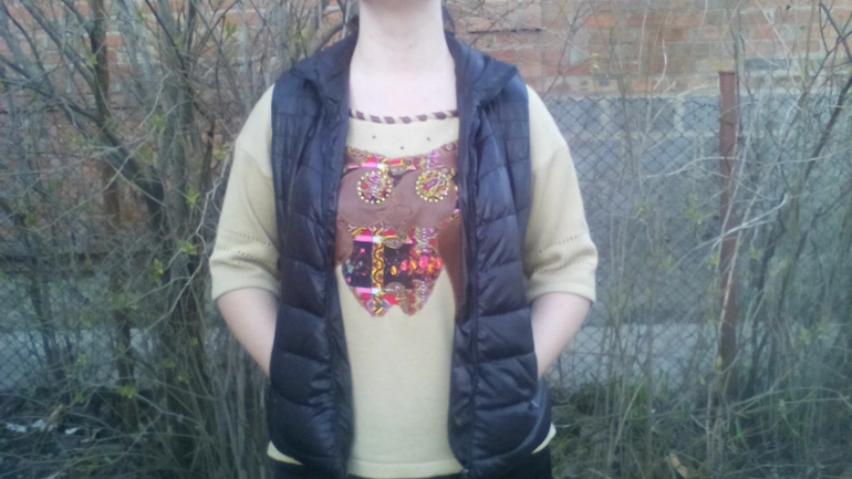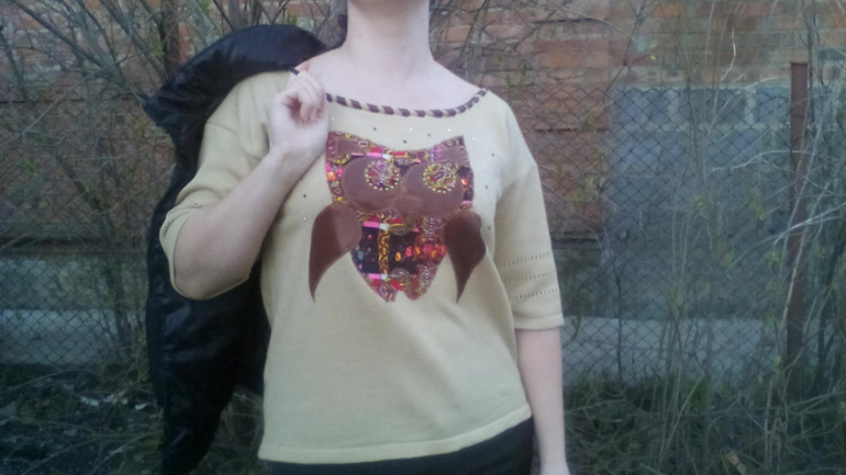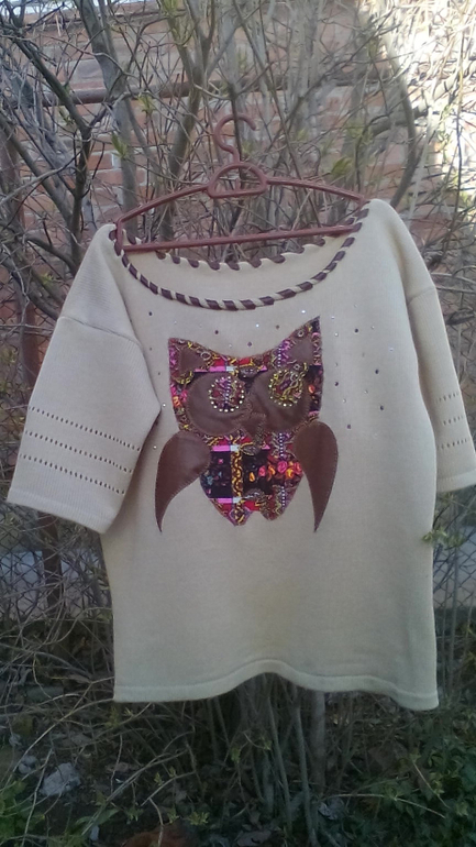 Свитер связан из бобинной пряжи в три нити.Аппликация сова из ткани и кусочков кожи,горловина лодочкой свободный силуэт свитера.Машина Тойота 901/501.