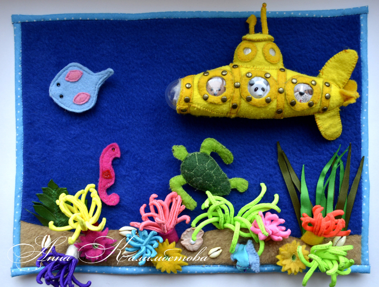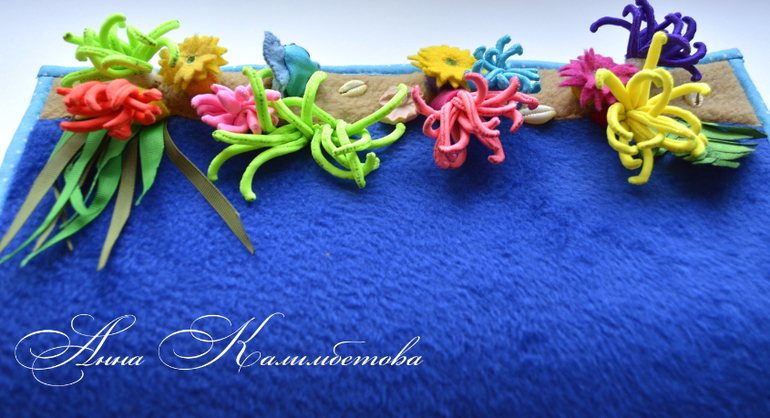 2. Игровое панно "На дне морском". Идея не новая, но мы решили сделать настоящий коралловый риф, а мама придумала сшить актинии разного цвета для лучшей тактильности и реалистичности.