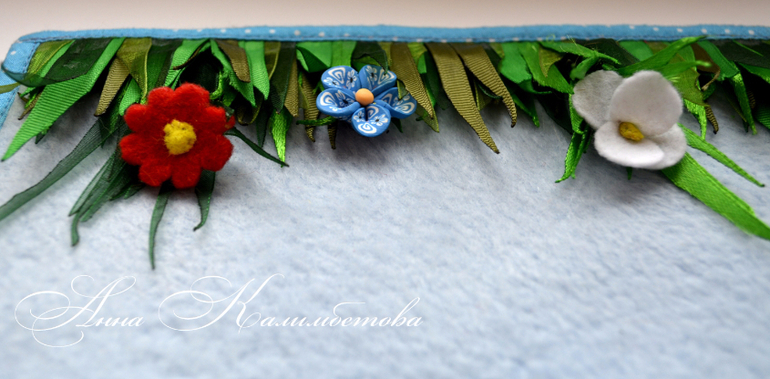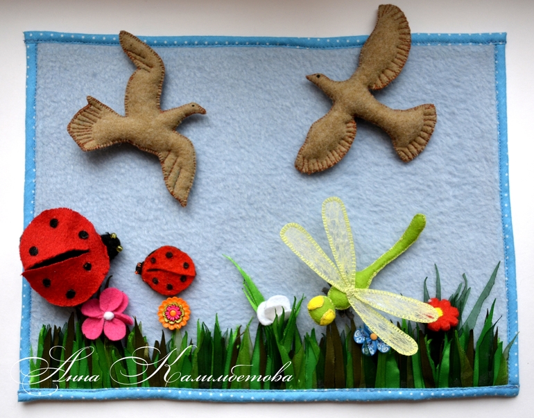 Внизу - травка, цветочки, и просто голубой фон. Можно повесить на бортик кроватки, но мы просто кладем на стол играем.