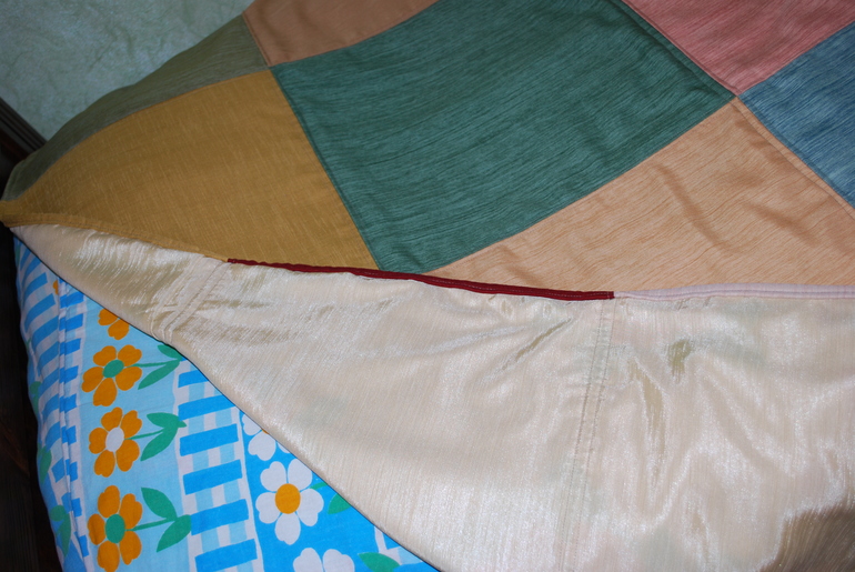 хотела сделать окантовку аталсной лентой, наживулила все эти метры, но т.к. покрывало у меня матовое, а атласная лента блетящая, пришлось все распороть-выглядело-это просто ужасно. Сделала простую подгибку и просторочила по контуру.