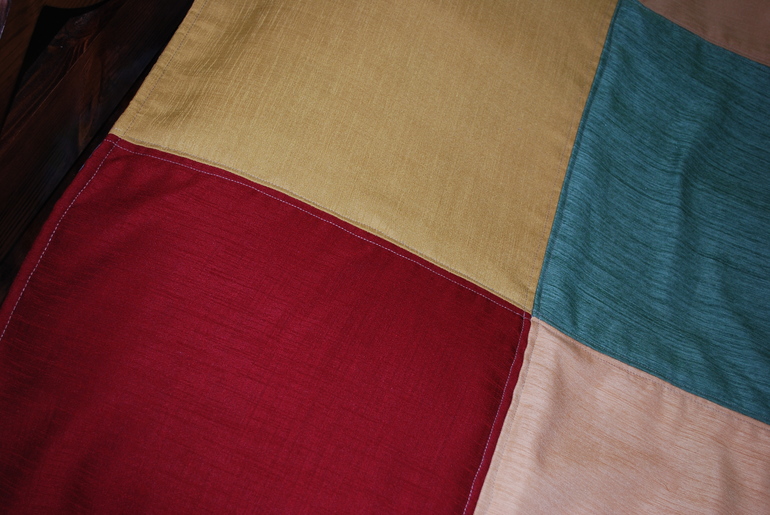 Ткань шторная и сверху кусочками и снизу целым куском-бежевая. А между ними проложила старый плед.