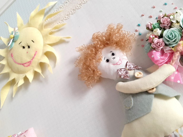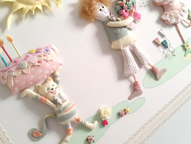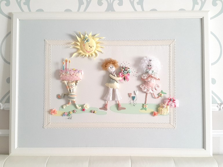 Декор, витражи.Вот, родилось еще одно панно, большое 100*70см.))) В этот раз для интерьера детского уголка в местной фотостудии "Шоколад". Все в тон заданным стенам и другим интерьерным решениям) Итак: День Рождения, подарки, радостное настроение, хорошая погода, полосатый кот, огромный торт, юный джентльмен с ароматным букетом и конечно нарядная именинница))